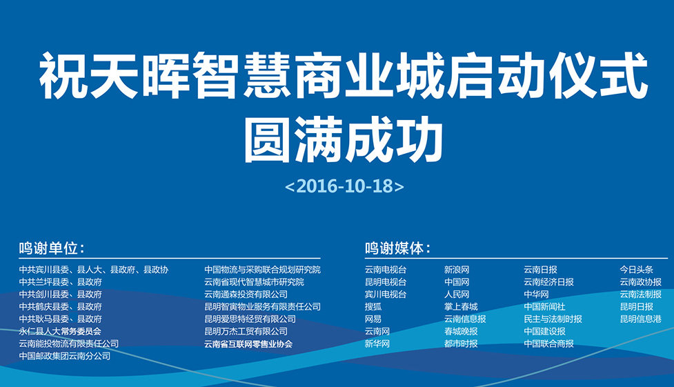 2016年10月18日,由云南天暉投資有限公司、云南天度投資集團有限公司和云南天暉城經(jīng)營管理有限公司聯(lián)合推出的“天暉智慧商業(yè)城”在大理賓川正式啟動。2017年1月19日,天暉城O2O眾創(chuàng)空間落戶賓川,大理州委常委、賓川縣委岳黎松書記、縣政府楊澤亮縣長、縣人大張成良主任、縣政協(xié)文慧君主席等相關領導及縣各部委辦局負責人參加了本次活動。