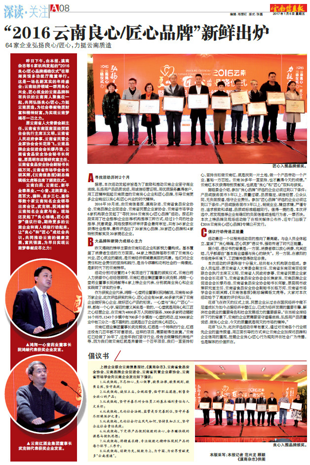 昨日下午,由云南信息報(bào)、滇商雜志、云南省民營(yíng)企業(yè)家協(xié)會(huì)、云南省食品協(xié)會(huì)等6家機(jī)構(gòu)發(fā)起的“2016良心/匠心品牌揭曉儀式”在翠湖賓館多功能廳隆重舉行。這是一場(chǎng)名副其實(shí)的年終盛會(huì):云南經(jīng)濟(jì)領(lǐng)域一群用良心興業(yè)、匠心筑業(yè)的云南品牌和有共識(shí)的云南商人聚集在一起,共同弘揚(yáng)良心/匠心,力挺云南質(zhì)造,為社會(huì)奉獻(xiàn)物質(zhì)財(cái)富和精神財(cái)富,為實(shí)現(xiàn)云南夢(mèng)竭盡一己之力。