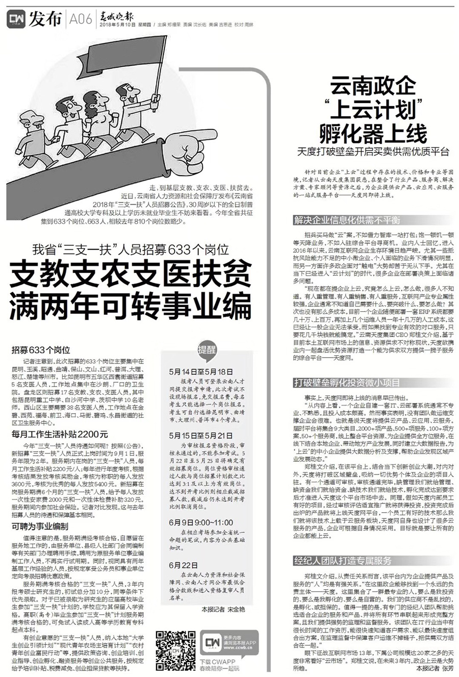 《春城晚報》關(guān)于天度提名為“一站式商業(yè)服務云平臺”的報道