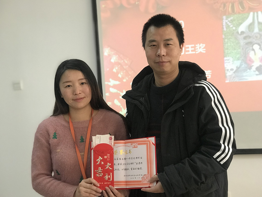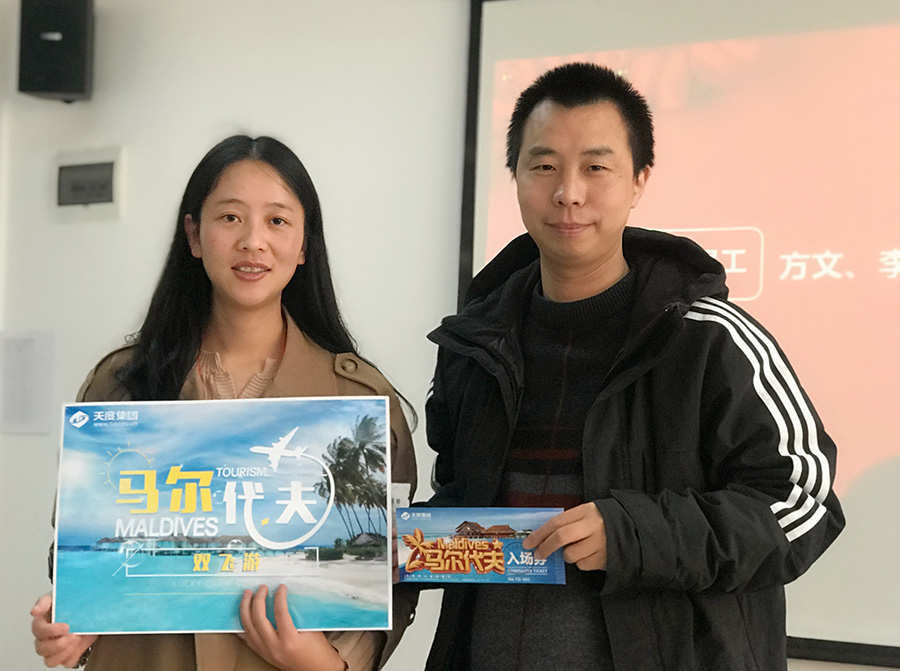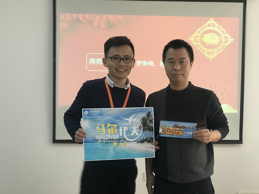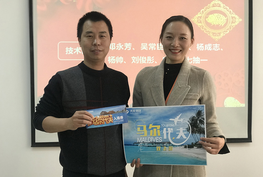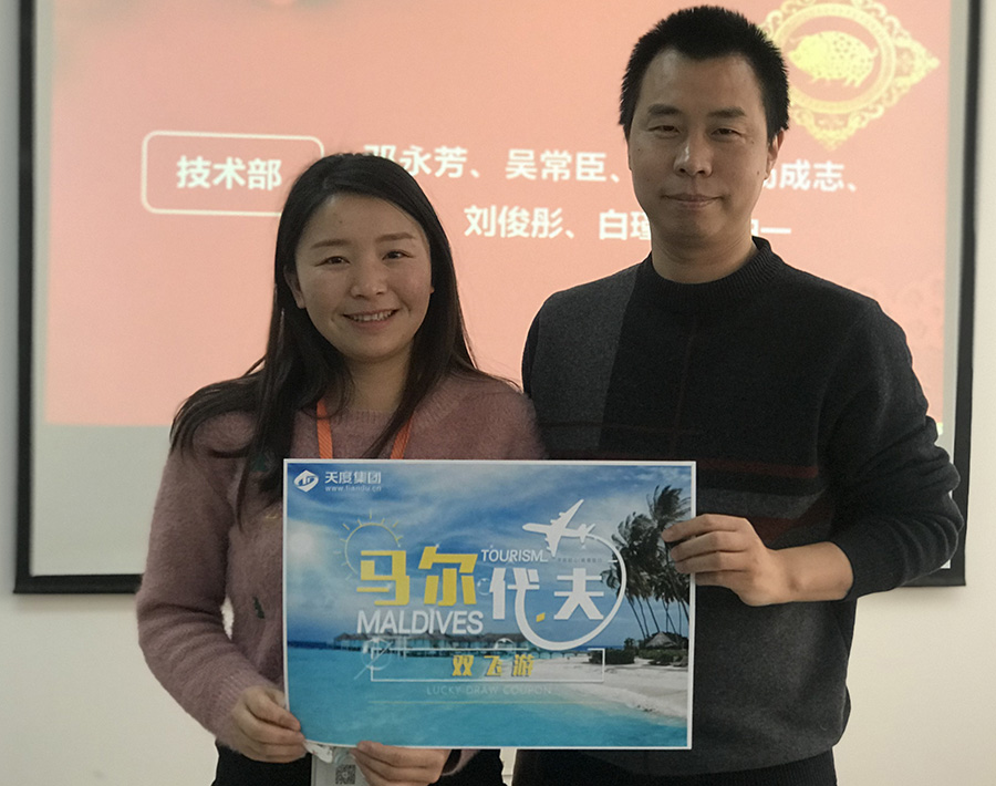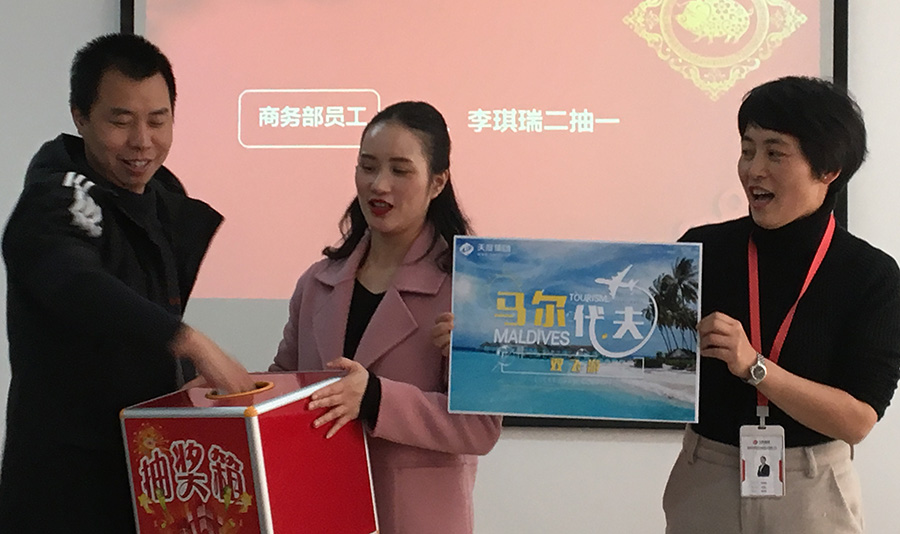 天度網(wǎng)絡(luò)公司今年拿出數(shù)十萬現(xiàn)金紅包,由楊總和陸總進(jìn)行發(fā)放(集團(tuán)每個(gè)公司的獎(jiǎng)勵(lì)和獎(jiǎng)金發(fā)放都是單獨(dú)進(jìn)行,據(jù)悉,集團(tuán)今年不管是獎(jiǎng)金總額、還是獎(jiǎng)金單額都超過往年,總額超過7位數(shù))。公司對(duì)2018年度各部門優(yōu)秀同事進(jìn)行了表彰,并發(fā)對(duì)各個(gè)獎(jiǎng)項(xiàng)進(jìn)行發(fā)放,同時(shí)鄭董事長現(xiàn)場(chǎng)抽取了“馬爾代夫帶薪休假旅游”的名額。