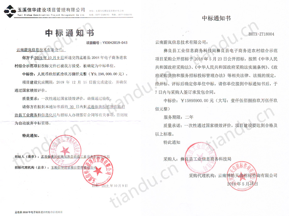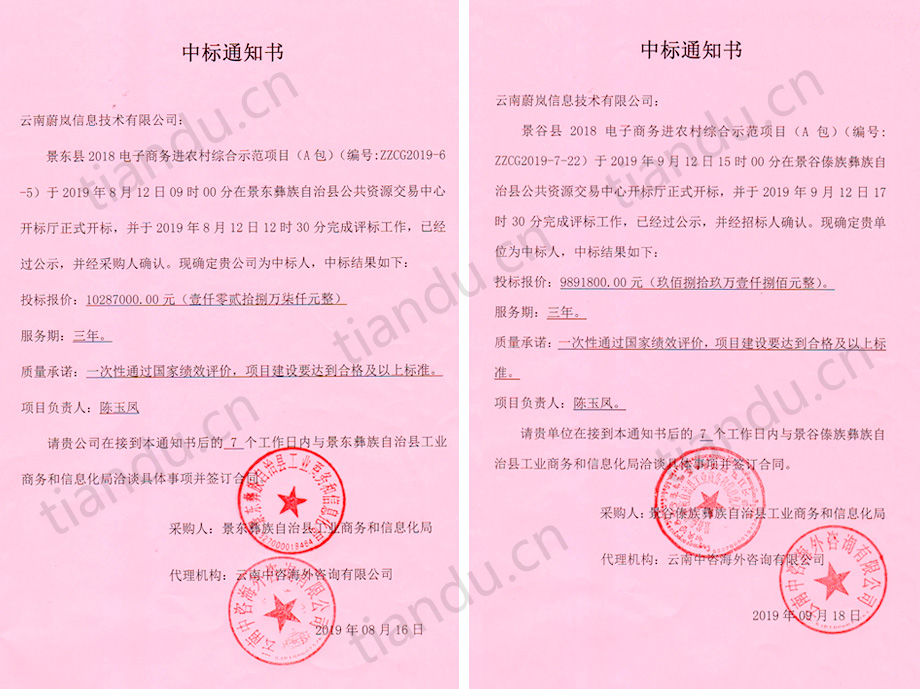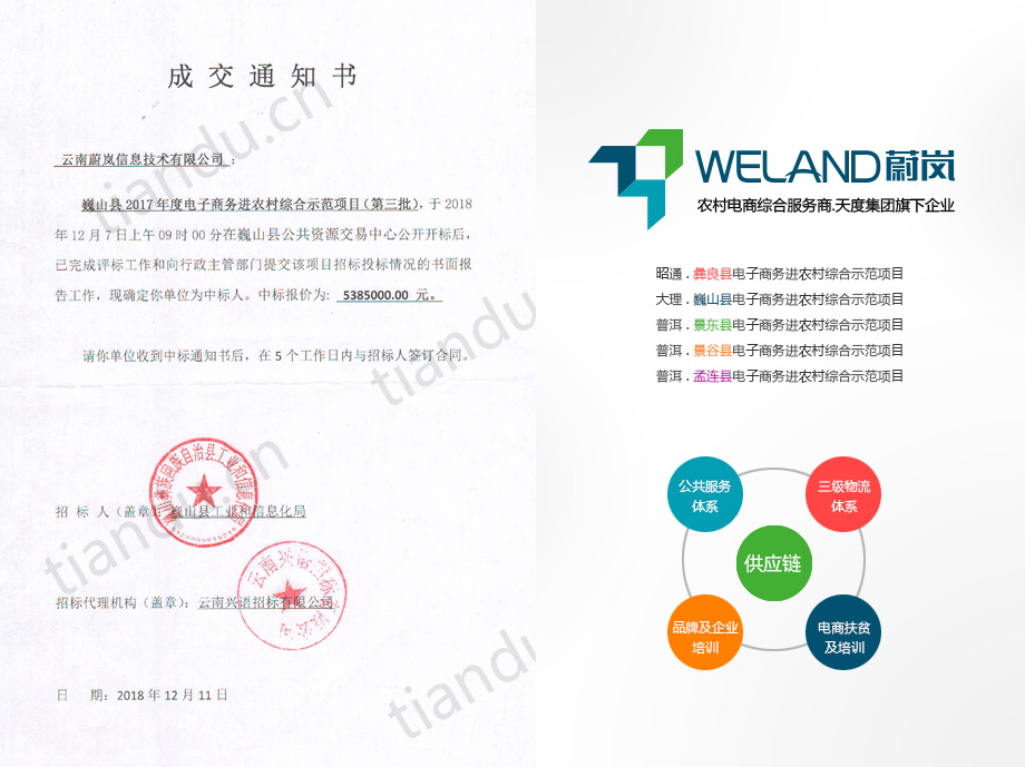 祝賀天度集團(tuán)旗下“云南蔚嵐信息技術(shù)有限公司”中標(biāo)景東縣、景谷縣、孟連縣等三個(gè)縣的電子商務(wù)進(jìn)農(nóng)村綜合示范項(xiàng)目,目前云南蔚嵐信息技術(shù)有限公司已經(jīng)為昭通市彝良縣、大理州巍山縣、普洱市景東縣、普洱市景谷縣、普洱市孟連縣等5個(gè)縣提供了國(guó)家電子商務(wù)進(jìn)農(nóng)村綜合示范縣項(xiàng)目的服務(wù)。