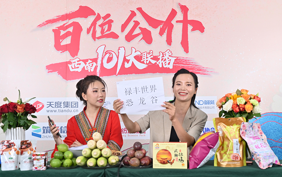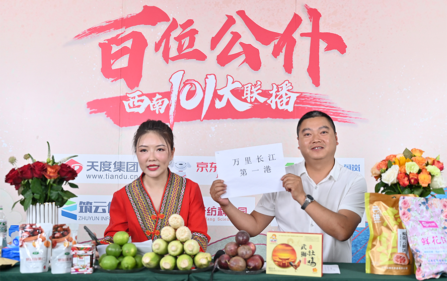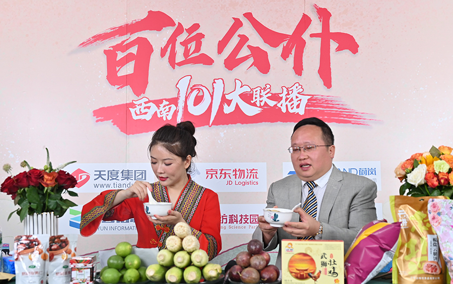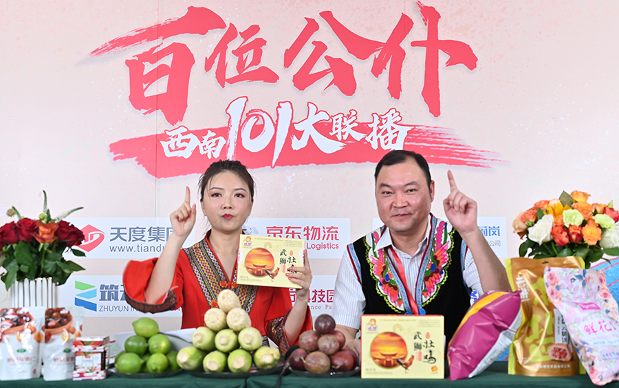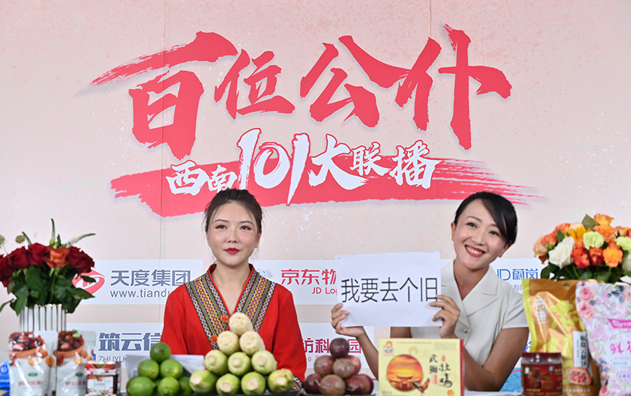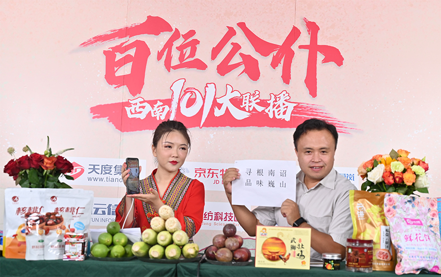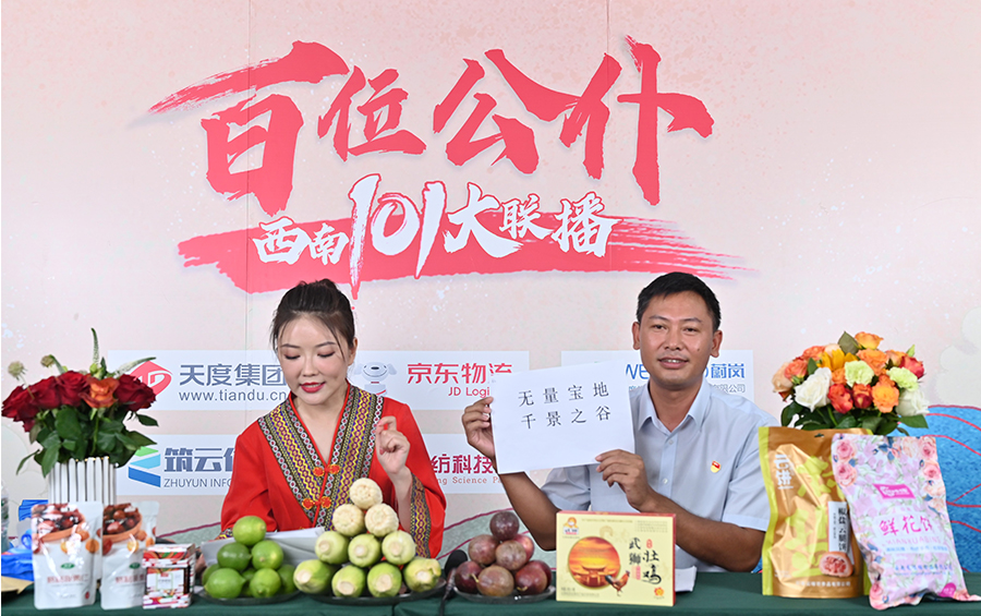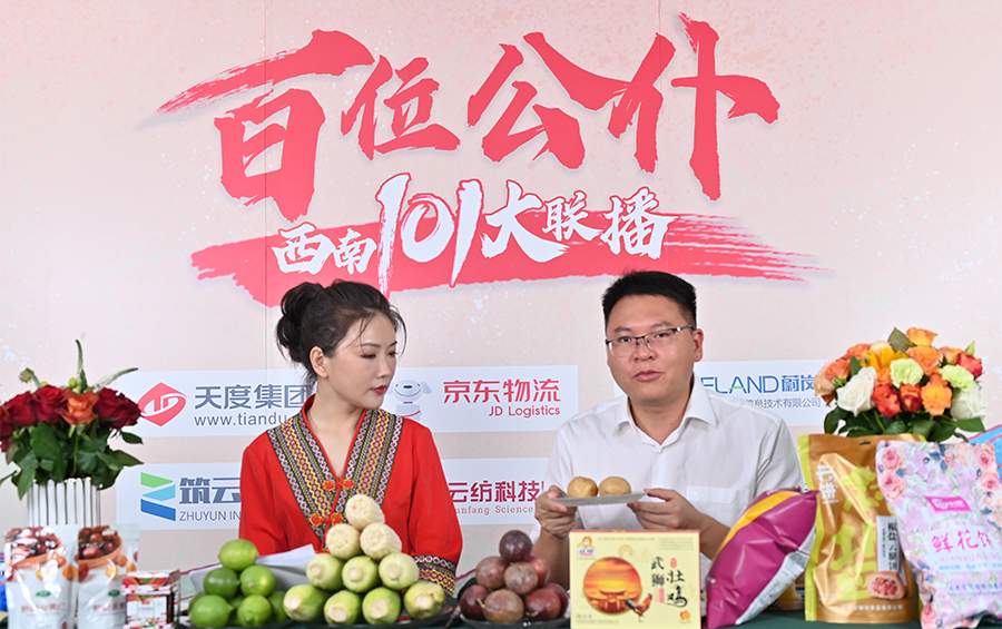 6月17日下午,“百位公仆,西南101大聯(lián)播”大型助農(nóng)直播活動(dòng)在云紡科技園直播基地舉行,來(lái)自云南巍山、南澗、水富、個(gè)舊、開(kāi)遠(yuǎn)、彝良、武定、景東、景谷等縣(市)的11位副縣(市)長(zhǎng),與四川知名電視主持人、直播記者郭秀一同走進(jìn)直播間,同框出鏡,為云南各地好貨代言,推動(dòng)農(nóng)產(chǎn)品推廣上行,助力脫貧攻堅(jiān)。近3小時(shí)的直播中,特色的農(nóng)產(chǎn)品、實(shí)惠的價(jià)格,以及豐厚的贈(zèng)品吸引了260多萬(wàn)網(wǎng)友圍觀。