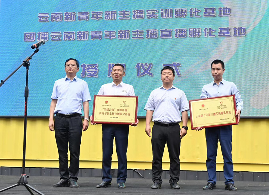 活動現(xiàn)場,共青團(tuán)云南省委黨組成員、副書記趙攀峰,云南廣播電視臺黨委委員、紀(jì)委書記曹渭海為云南紡織(集團(tuán))股份有限公司、云南天度投資集團(tuán)有限公司頒發(fā)了“團(tuán)播云南”直播基地、云南新青年新主播直播基地牌匾。