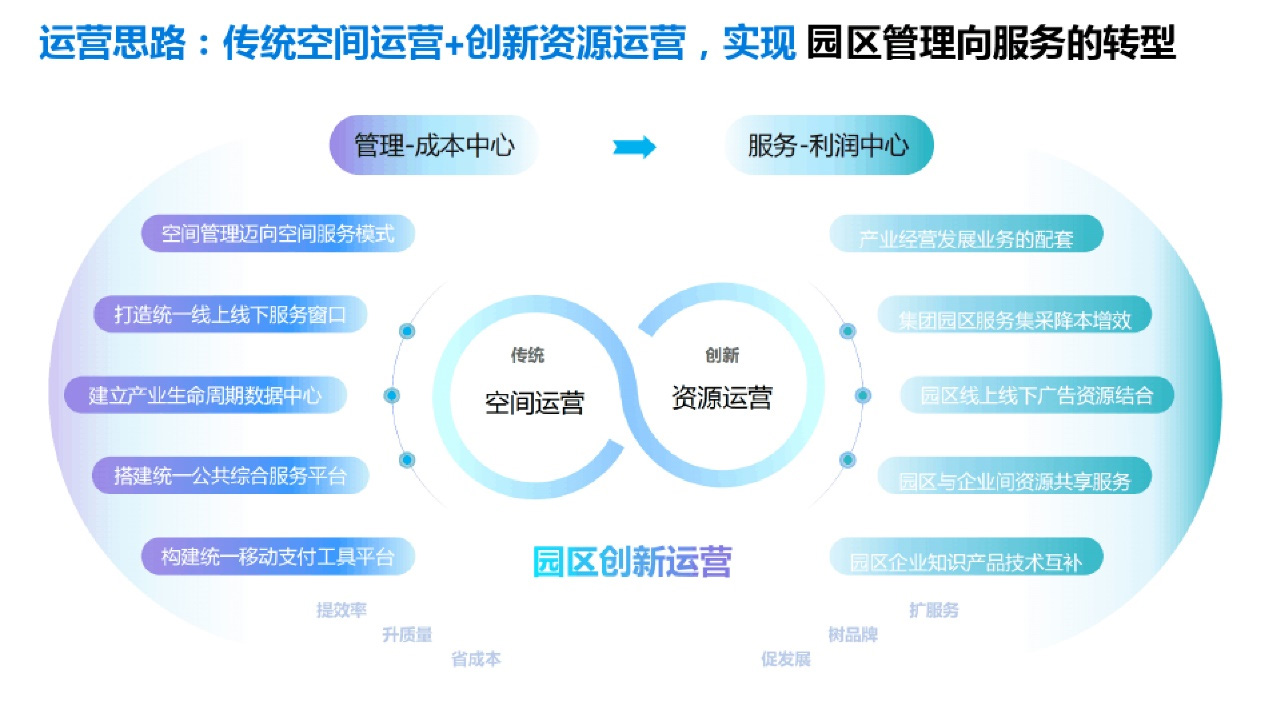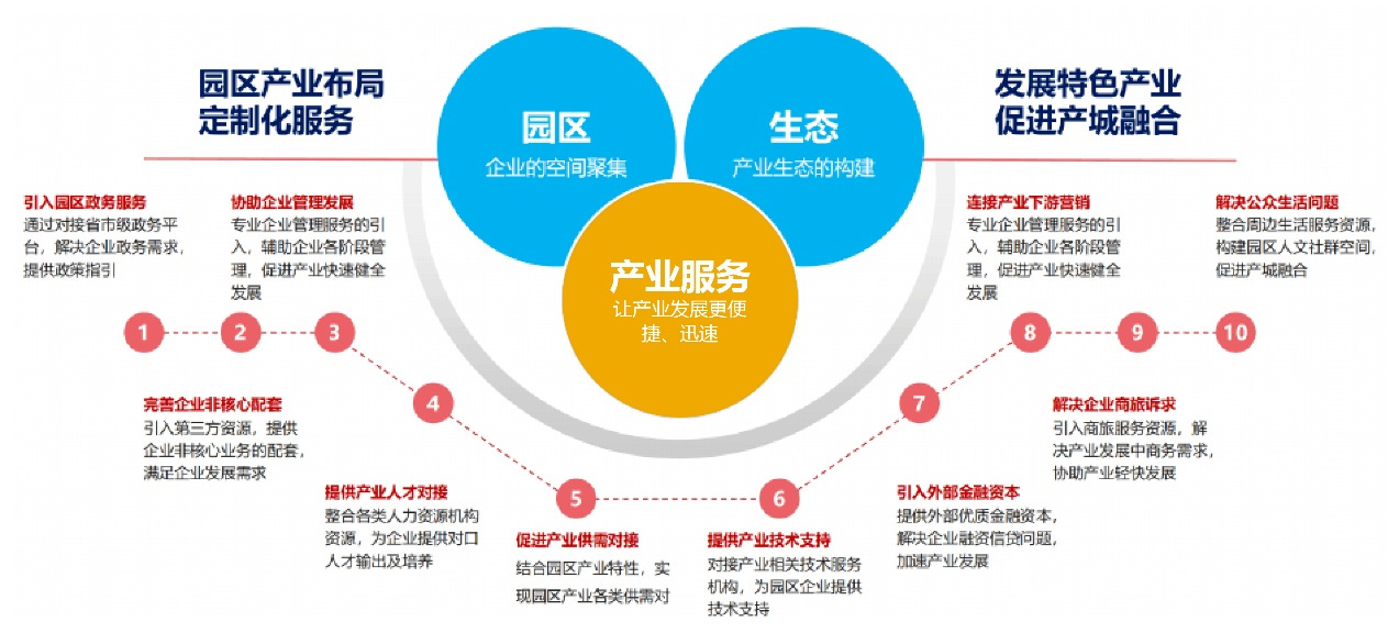 產(chǎn)業(yè)園區(qū)運營需要做到物業(yè)、商業(yè)與產(chǎn)業(yè),“三業(yè)”相輔相成,協(xié)同并進,具有良好的產(chǎn)業(yè)支撐和配套條件,以產(chǎn)業(yè)鏈導向,各種生產(chǎn)要素重新整合,形成穩(wěn)定的主導產(chǎn)業(yè)和具有上、中、下游結構特征的產(chǎn)業(yè)鏈。運營始終要圍繞產(chǎn)業(yè),以產(chǎn)業(yè)集聚、產(chǎn)業(yè)生態(tài)的打造為終極目標,需要大數(shù)據(jù)的支撐來進行不斷地選擇與塑造,按市場化方式運營,建立以消費市場、企業(yè)需求為導向的反向研發(fā)機制,不僅要為入駐企業(yè)提供空間服務,更要在企業(yè)發(fā)展的各個時間段充當合伙人,與入駐企業(yè)共成長,幫助入園企業(yè)建立研發(fā)投入體系、質(zhì)量品控體系、產(chǎn)品標準體系,為全產(chǎn)業(yè)鏈發(fā)展提供全方位的產(chǎn)業(yè)技術創(chuàng)新支撐。