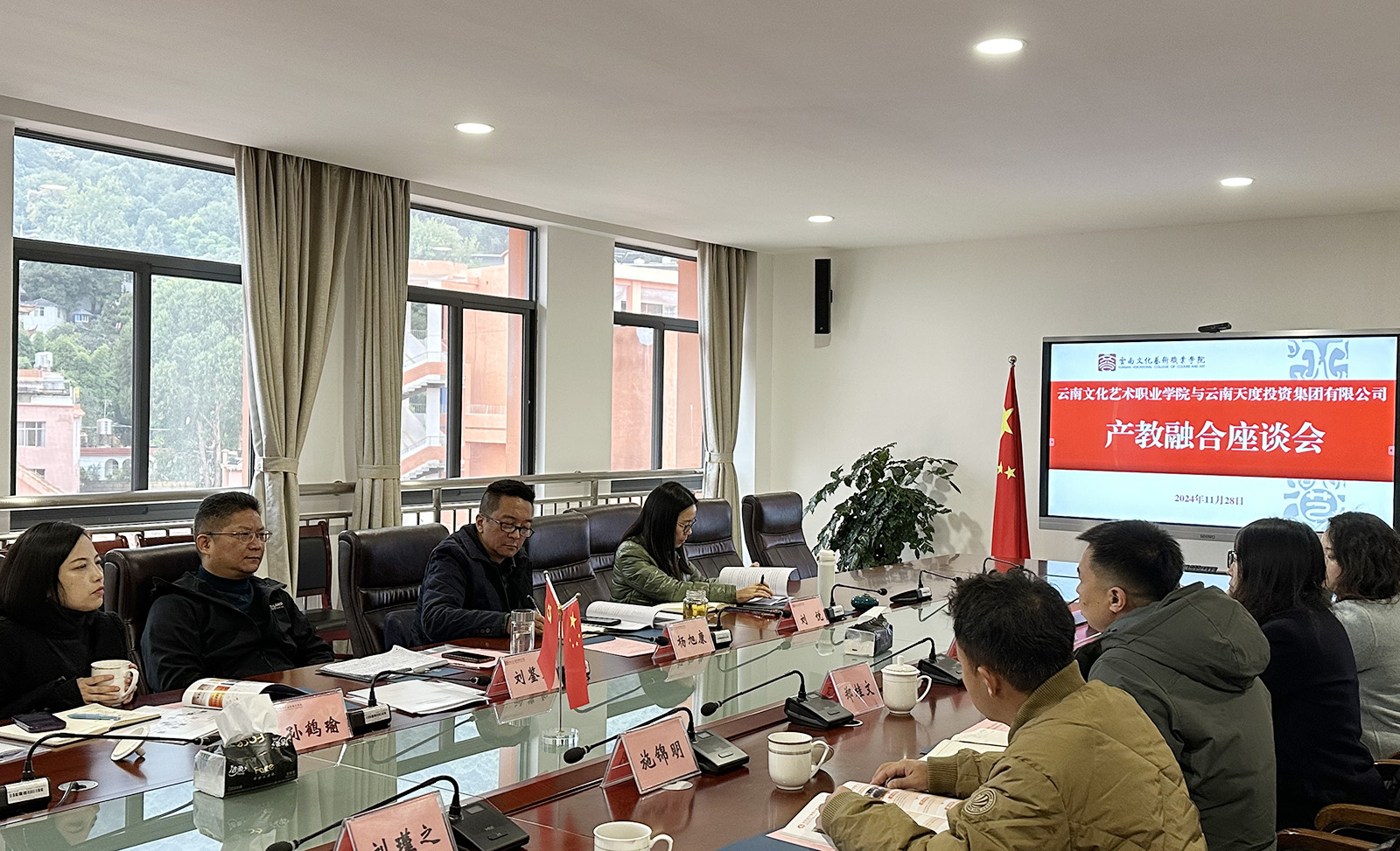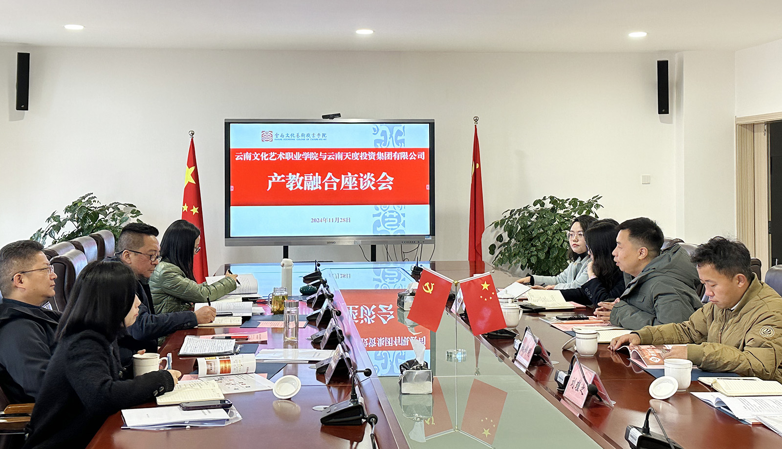 為深入貫徹省委、省政府關于推動產教融合的政策精神,加強學校與產業(yè)的深度融合發(fā)展,打造校企協(xié)同職業(yè)教育發(fā)展新模式,11月28日上午,云南文化藝術職業(yè)學院與云南天度投資集團有限公司召開產教融合座談會。云南文化藝術職業(yè)學院黨委書記劉鑒允,黨委副書記、院長楊旭康,黨委委員、副院長孫鶴瑜,黨委委員、副院長劉悅;云南天度投資集團有限公司董事長鄭桂文、副總經理陳玉鳳、副總經理施錦明,云南天度科技發(fā)展有限公司總經理胡婷婷及相關負責人參加座談交流。